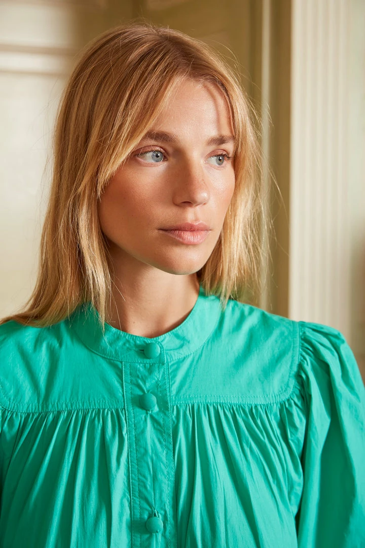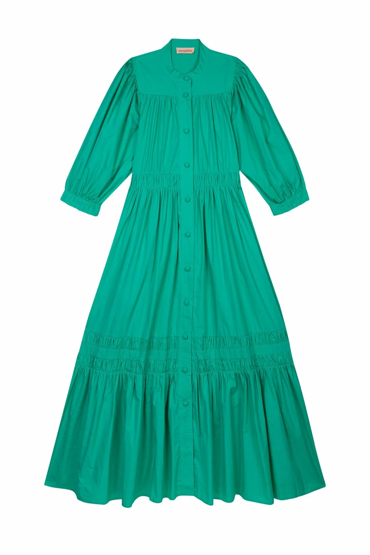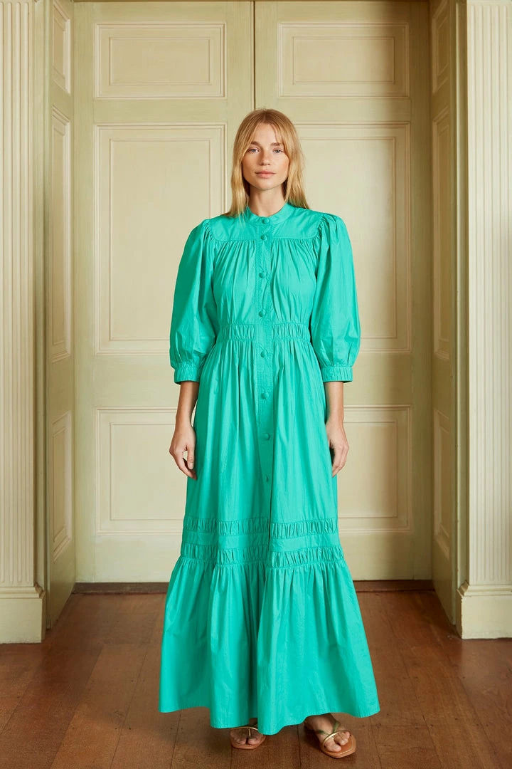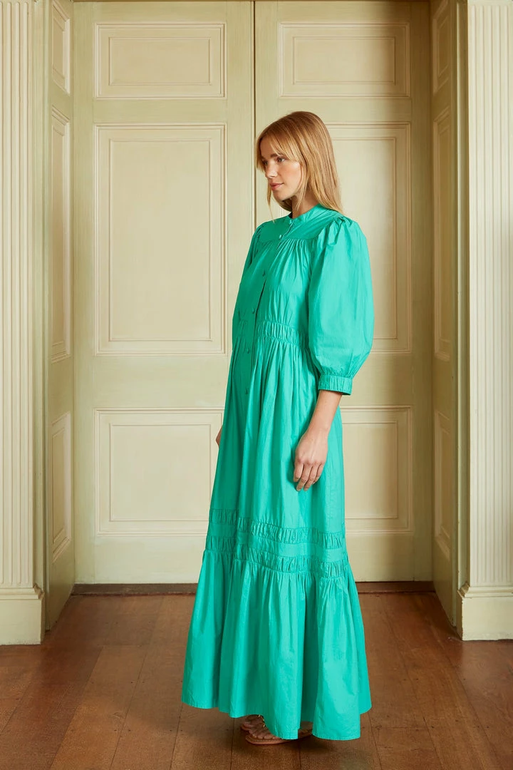 The Ruche Midi Dress is an eye-catching maxi dress made from 100% cotton poplin. There are lovely rouched details on the waist, cuffs and skirt and covered buttons down the full length of the dress.