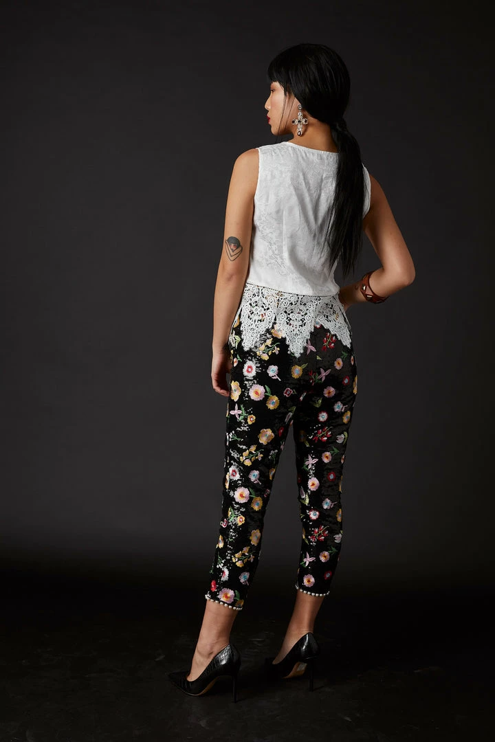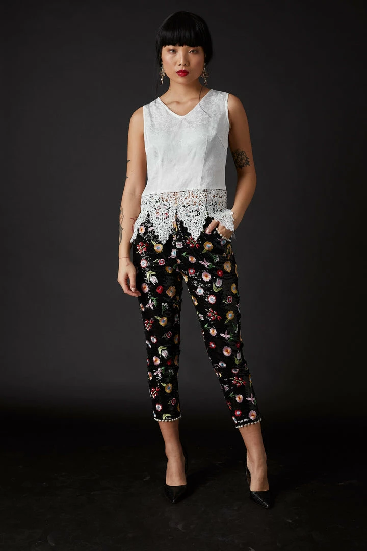 Named after the progressive princess for the Qing dynasty (circa 1800’s) Yu Der Ling (裕德龄), this beautifully embroidered piece is the perfect trousers for daily occasional events or evening out. With floral designs inspired by the early Tang dynasty period (618-907AD) this trousers combine a rich colour palette with a simple classic 1960’s style silhouette. We suggest choosing either the white Han City Vest or the white/black Derling Embroidered Jacket to compliment.