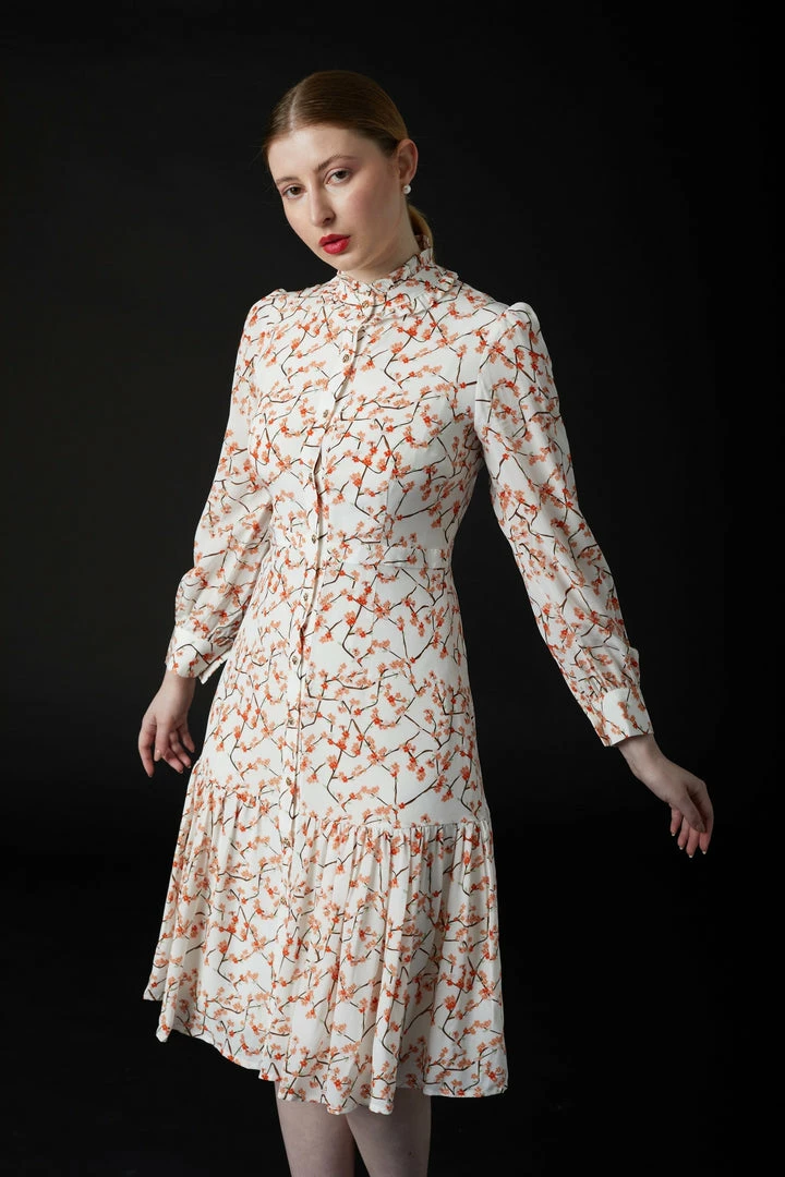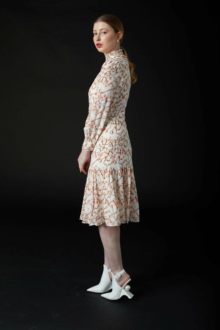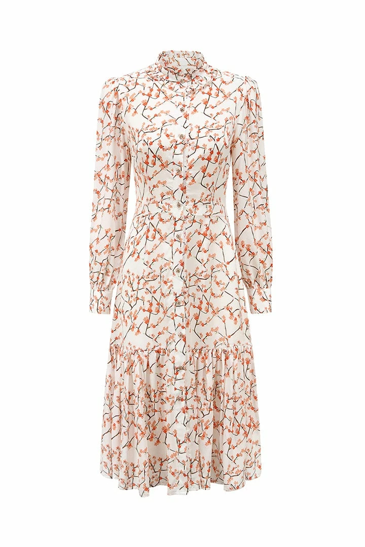 Our Plum Blossom Midi Dress is made using Crepe de Chine silk, making it lightweight and breathable. The silk drapes against the body to accentuate your natural shape. This dress is fully lined with silk for the most luxurious experience against your skin.