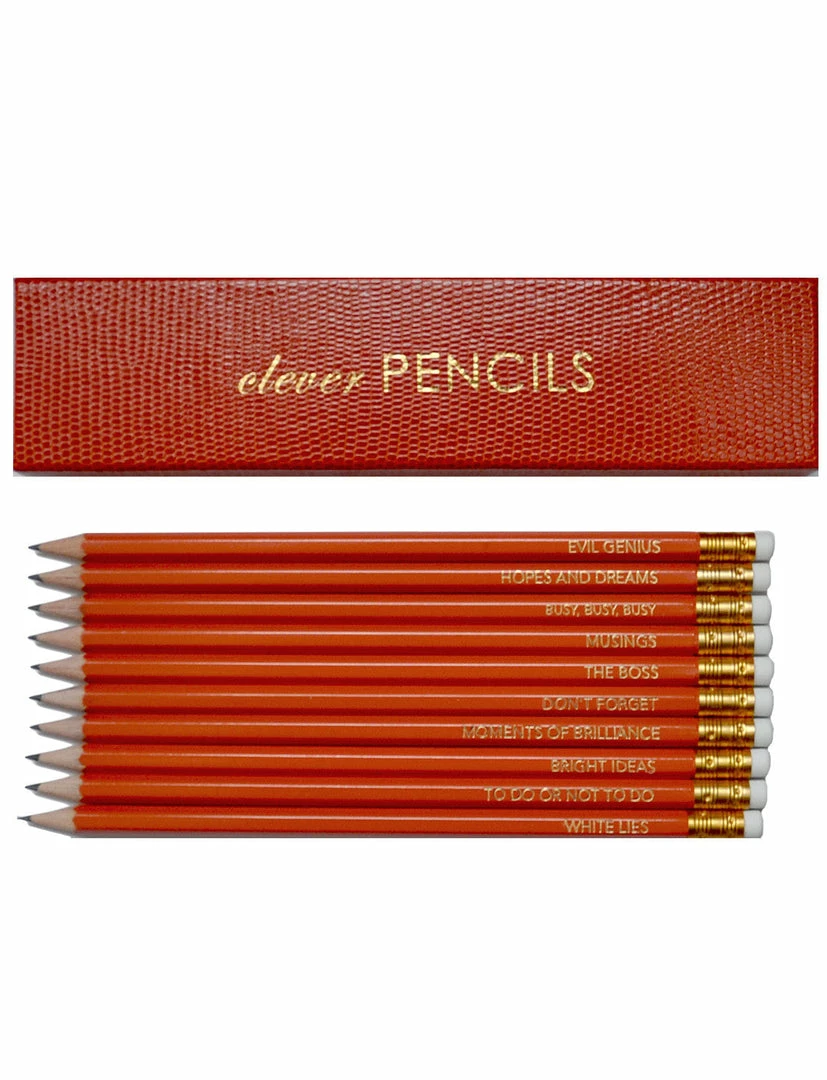 An elegant gift or something special for your own desk. Clever Pencils are packaged in an orange lizard embossed box. Each pencil has a unique saying designed to inspire a smile. The pencils are orange with gold lettering and a white eraser.Â