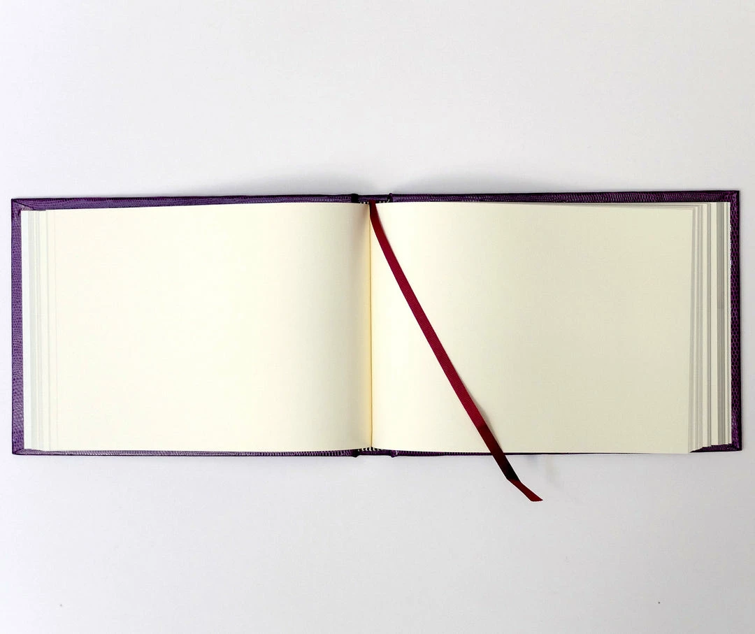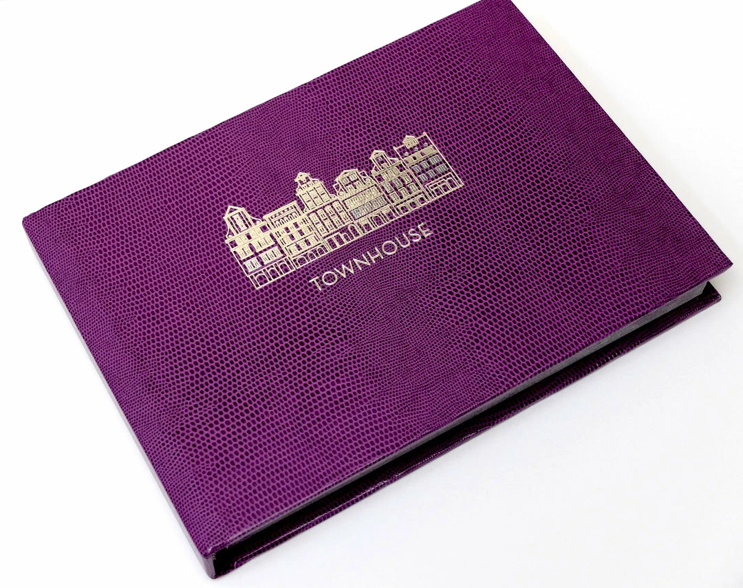 Our Guest Books are handmade in England by classically trained craftsmen. They are made from luxurious cream paper with gilt edges, covered in lizard embossed card.