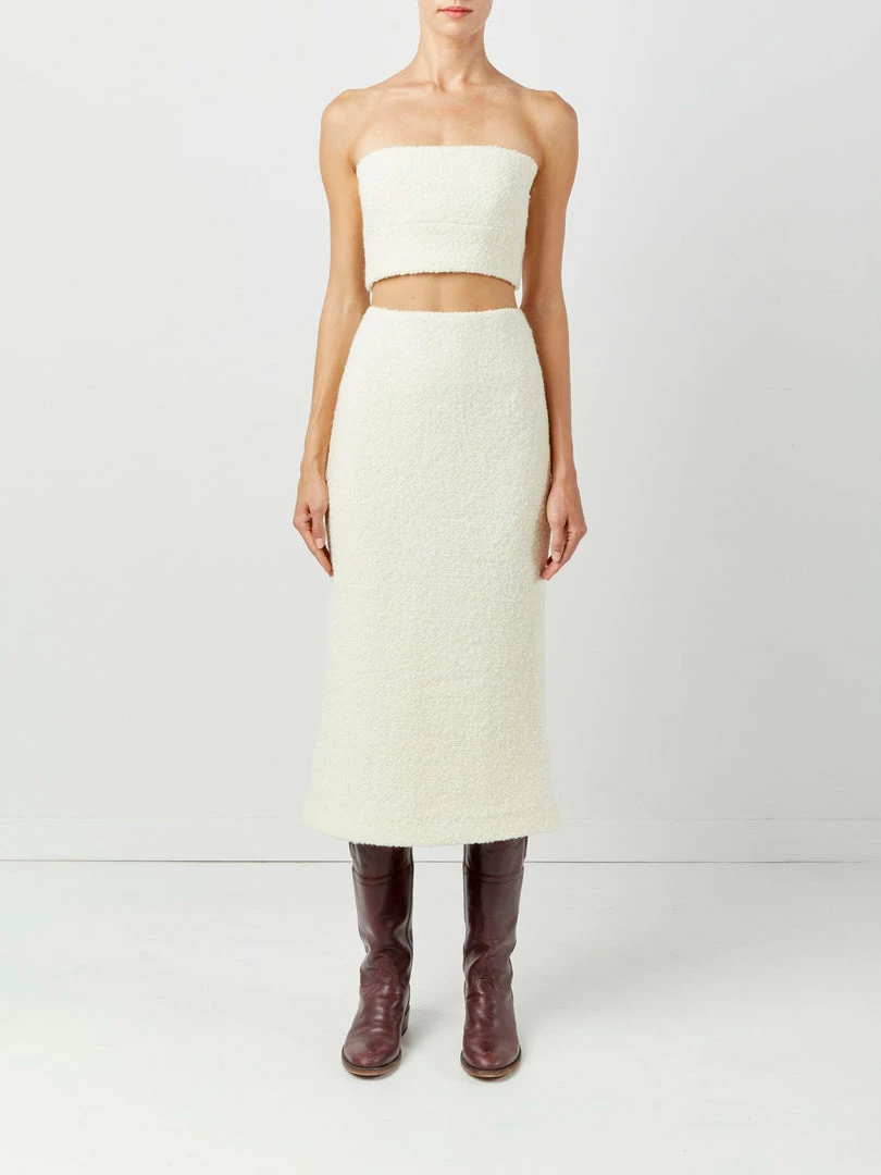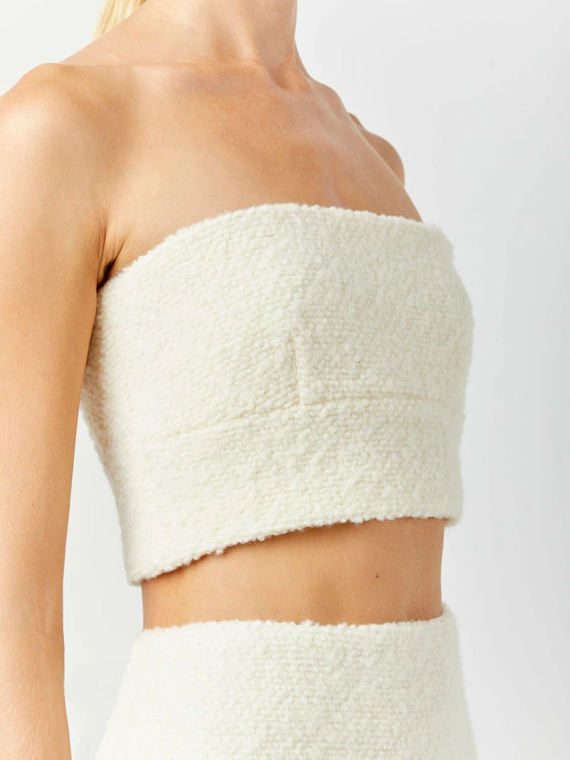 Featured in a dreamy boucle, this strapless top is sexy and understated. Pair with the Boucle Midi Skirt and Sweater Coat. Those with larger busts may wish to size up.