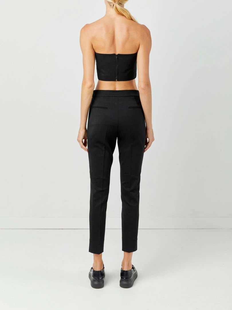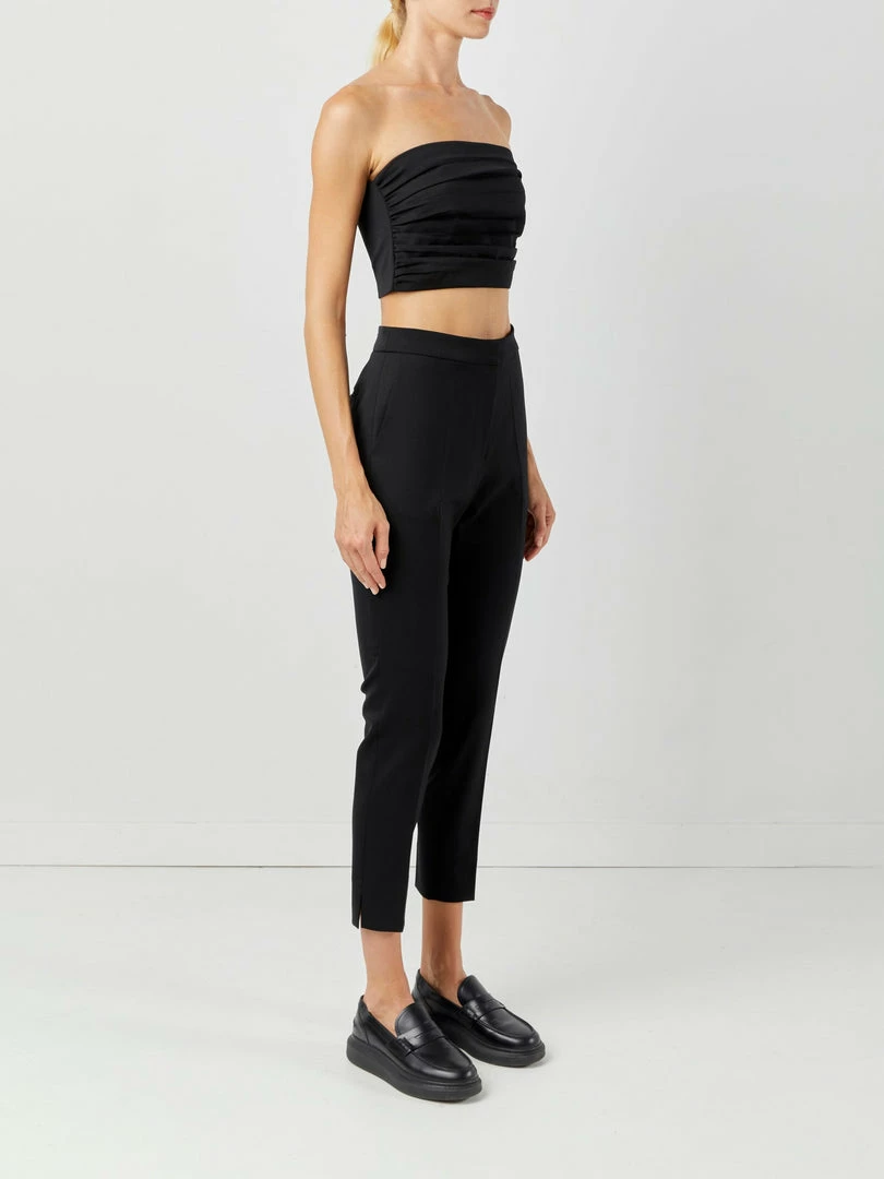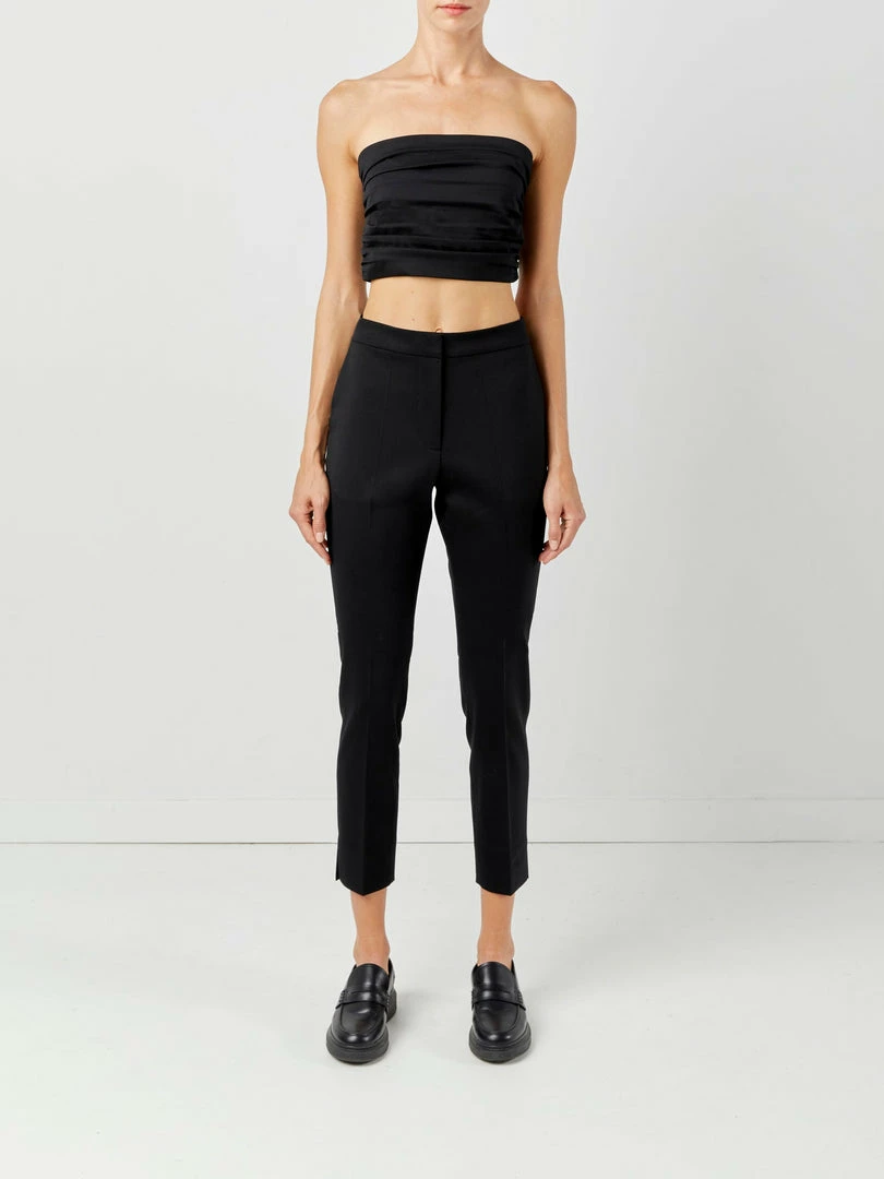 Sexy and sophisticated, this shirred wool top hits just at the navel and pairs with our coordinating cigarette pant and blazer, or our pleated skirt.