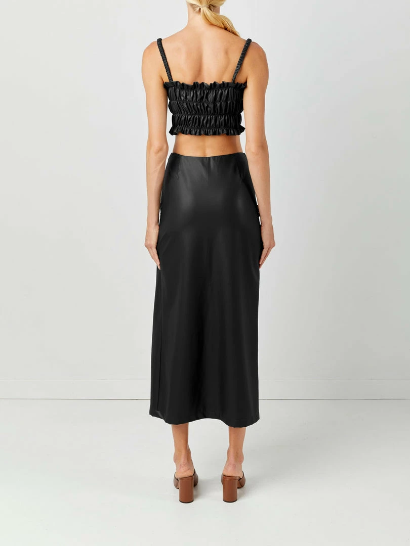 Great for day or night, this skirt looks best with our coordinating smocked top, but also pairs beautifully with one of our ribbed tops or body suit. Made from 100% vegan leather.