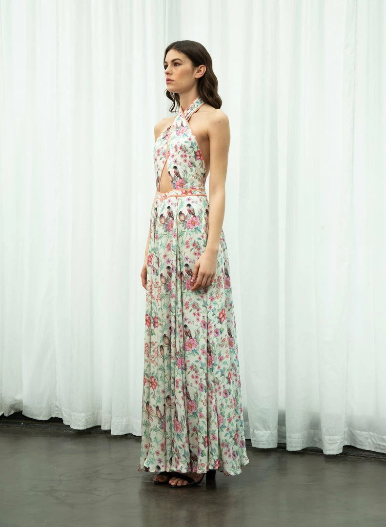 Made using rich satin fabric, and bold cross-neck silhouette, this dress is for the well-traveled woman whose personal style exemplifies her easy-going, yet fashion-forward approach to clothing. With attention to exceptional fit in love birds’ jaal print, this ensemble is crafted with an exotic, toes-in-the-sand spirit.