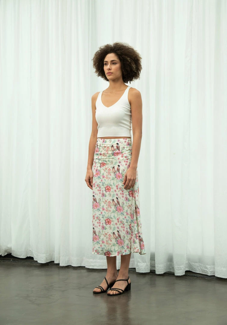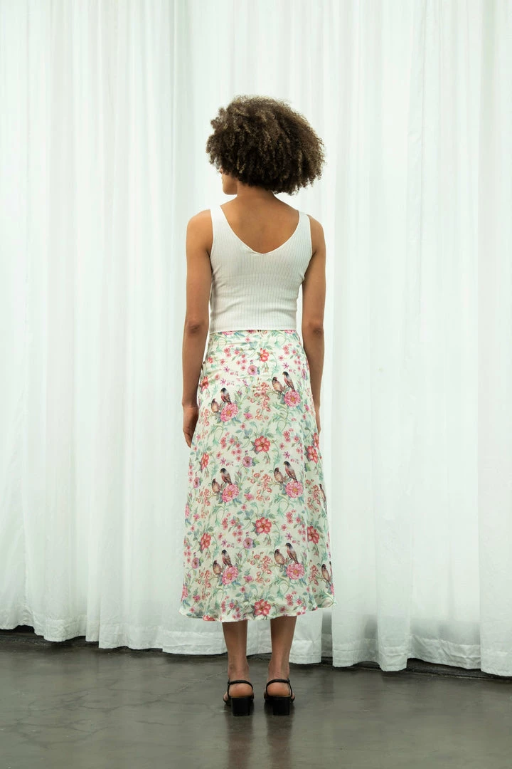 Breeze through summer in this sophisticated skirt, featuring dreamy floral and a minimalist silhouette adorned with overall love birds jaal prints. The soothing off-white color and the soft texture of satin make this skirt perfect for both evenings and for the hot, balmy days coming at us.