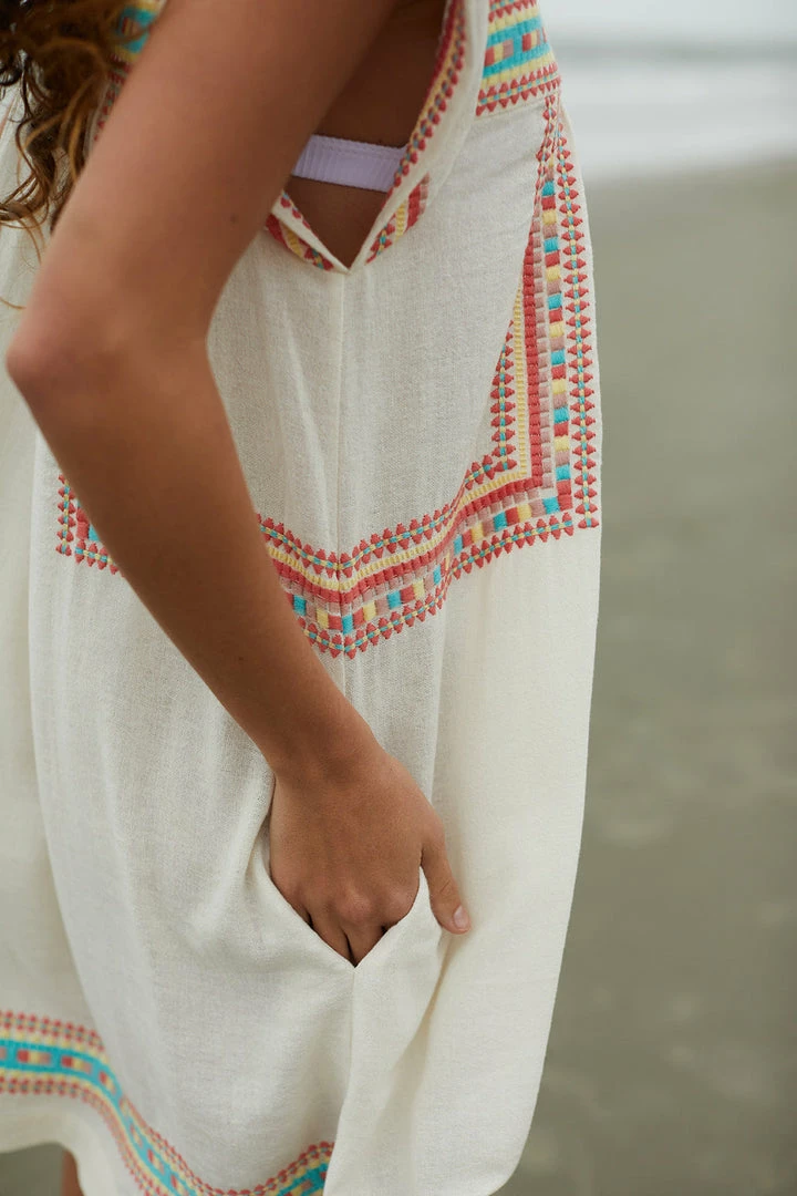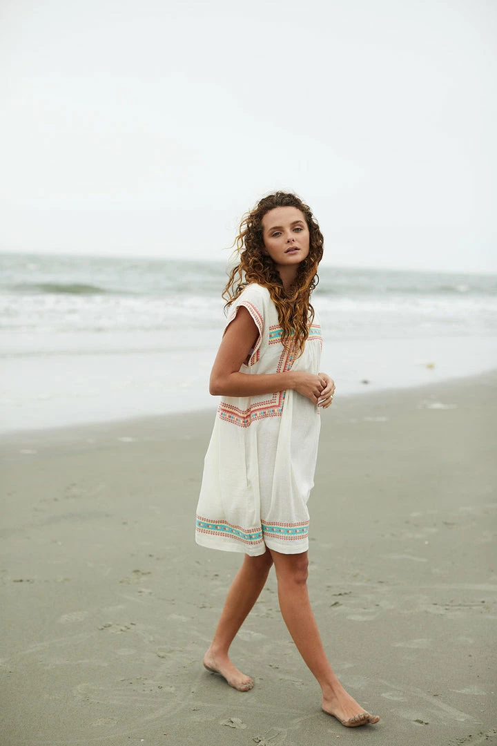 A playful, casual silhouette. Body framing embroidery detail. Hidden pockets.