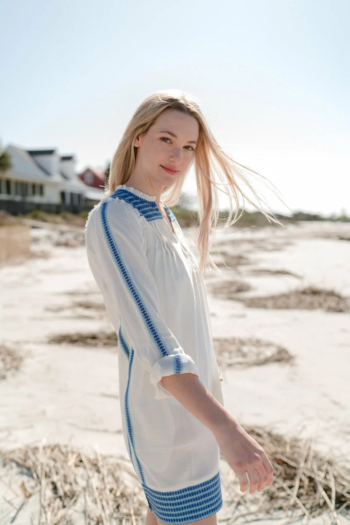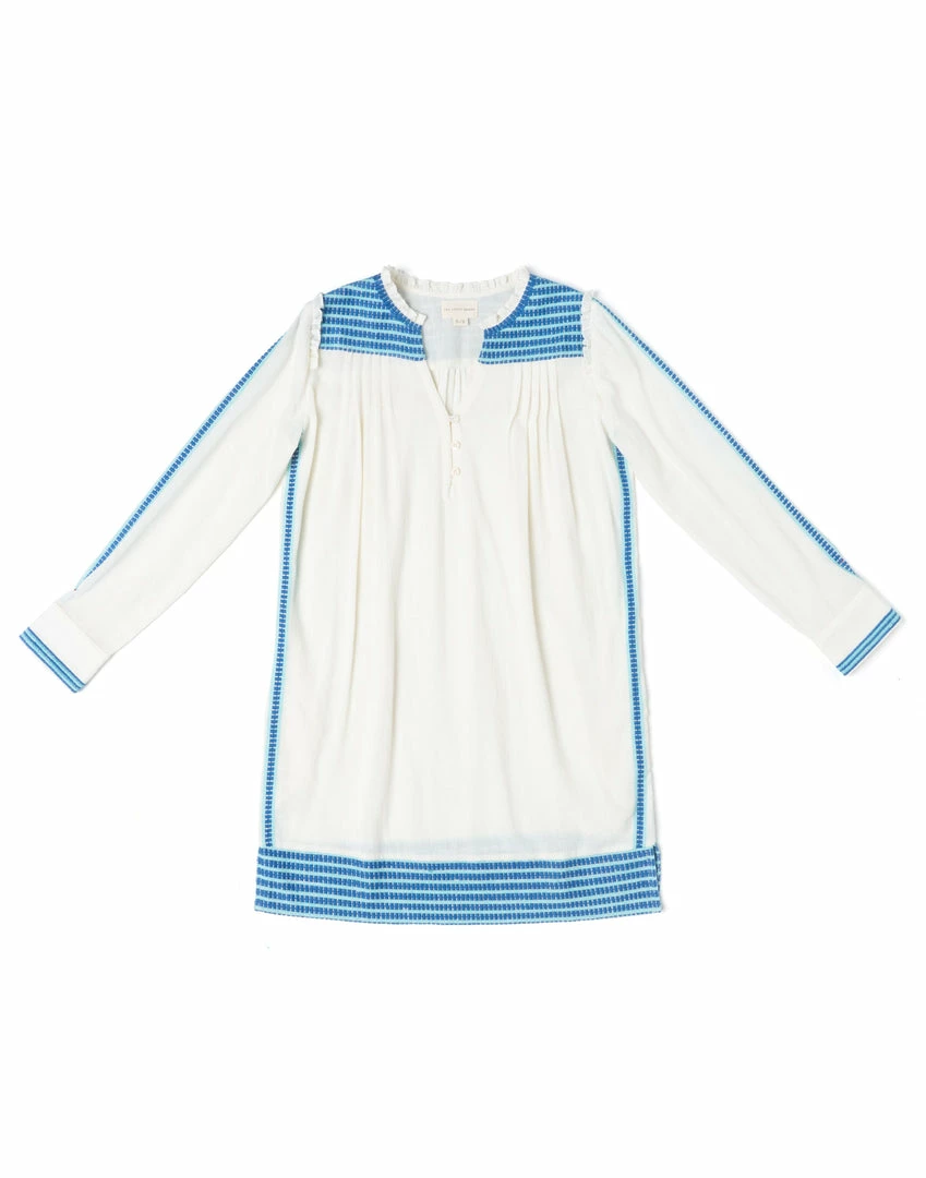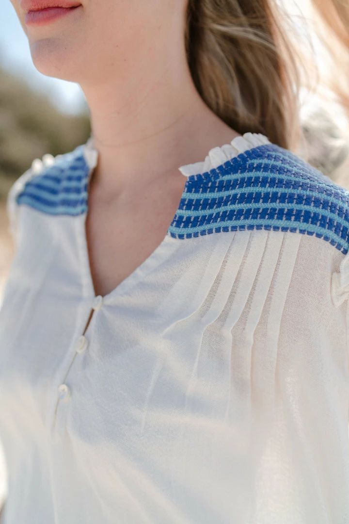 A simple silhouette with intricate embroidery at the shoulder and back yoke and at the hem. An easy, slightly oversized shape through the body with a shirttail hem. A soft ruffle at the shoulder seam adds a feminine touch to this casual shape. Three hook and eye buttons and soft pleating at the neck opening. Hidden pockets. Slightly sheer on the body.