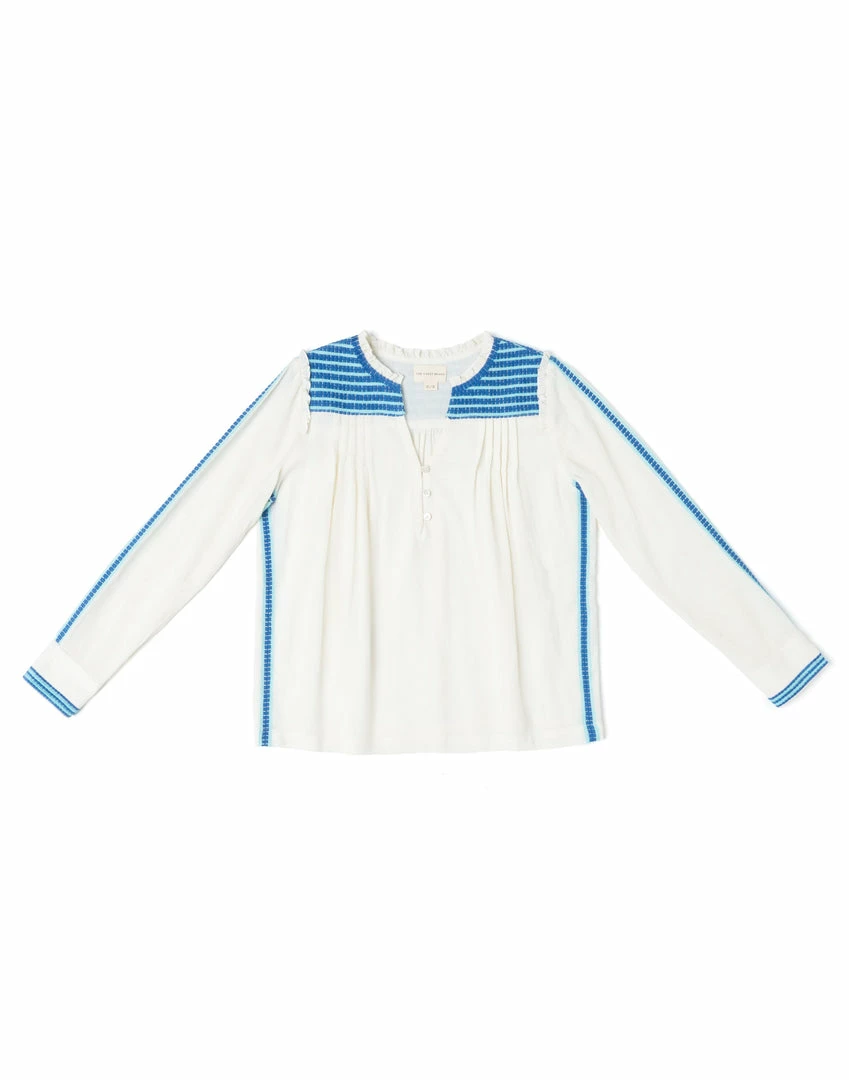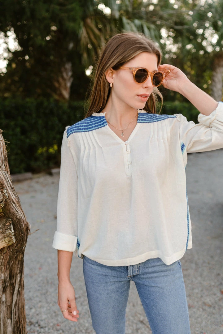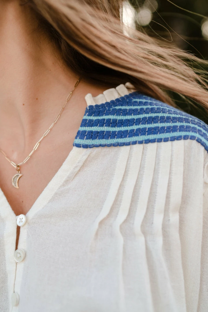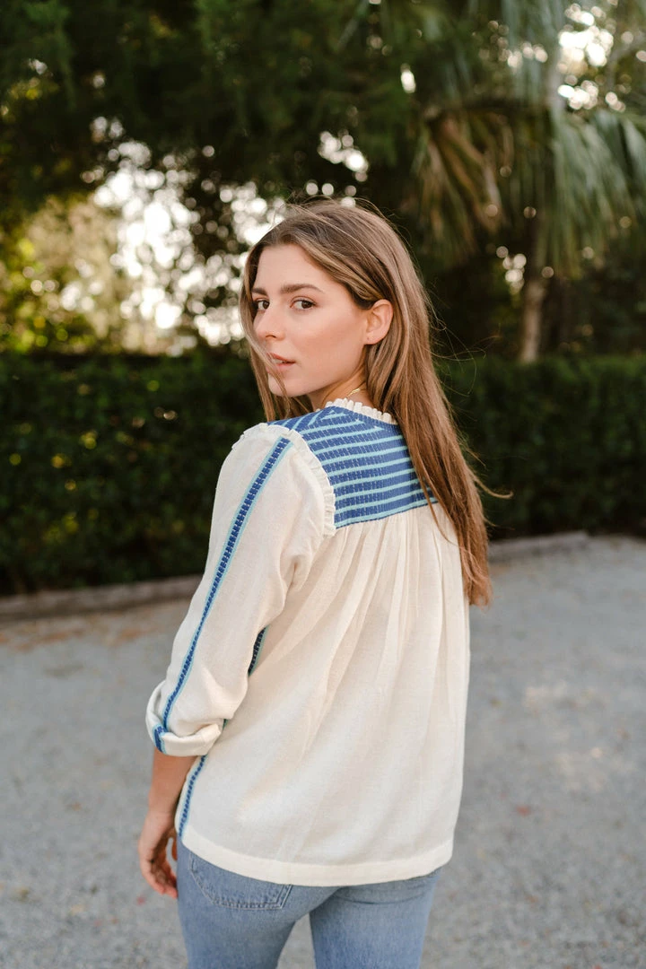 A simple silhouette with intricate embroidery at the shoulder, back yoke and along the outside of the sleeve. A soft ruffle at the shoulder seam adds a feminine touch to this casual shape. Three hook and eye buttons and soft pleating at the neck opening. Slightly sheer on the body.