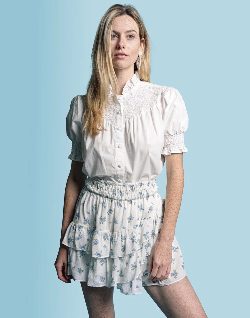 Our best-selling Nicole Shirt is back for spring in all new colors and prints. A smocked front and looser body that hits as the hip.