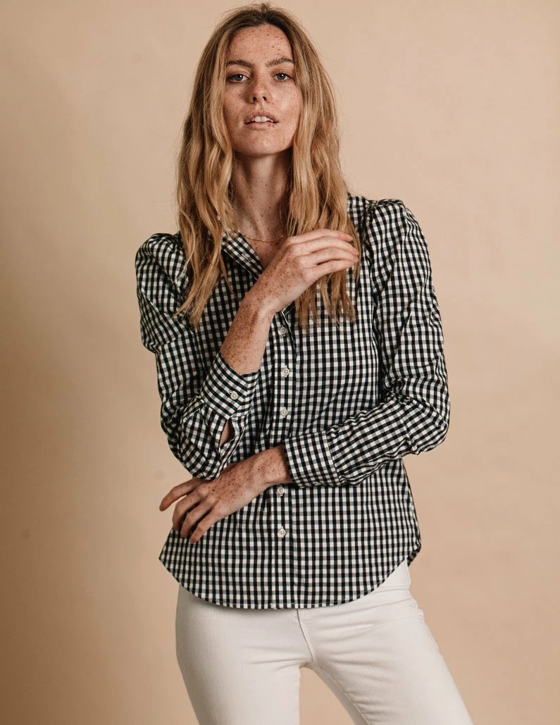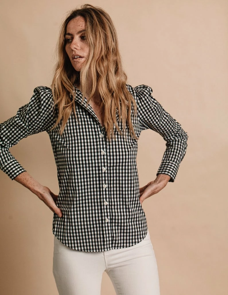 For business or pleasure, our puffed shoulder shirt is shapely in all the right places. Our perfect fit, but with a twist as the shoulder and with a stand collar.