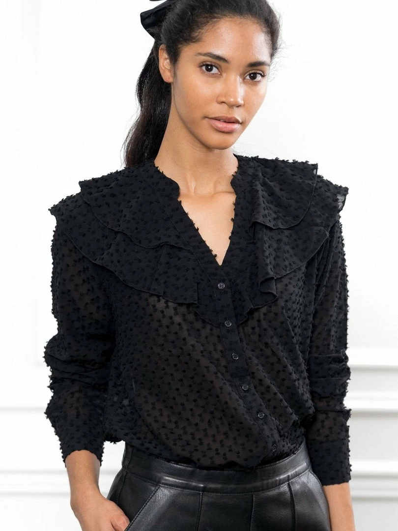 With a wide but subtle ruffle collar and open v-neck, this shirt will probably become the shirt you pull from your closet every day on repeat. Perfect with jeans and leather, it’s slightly sheer, but not too much.