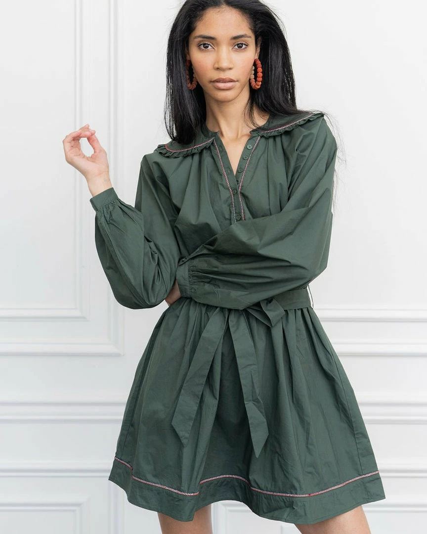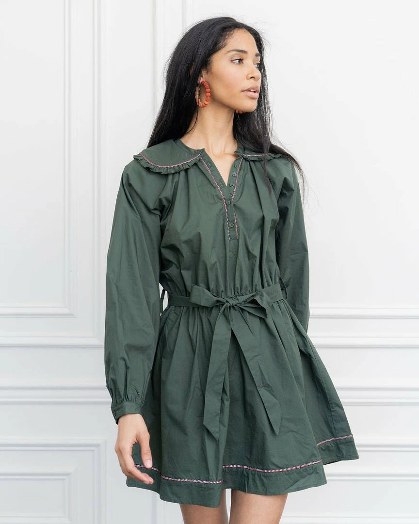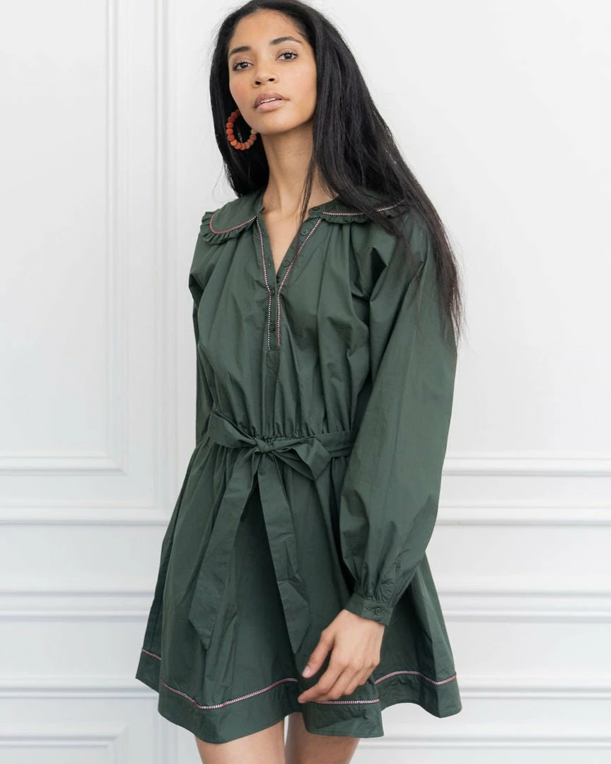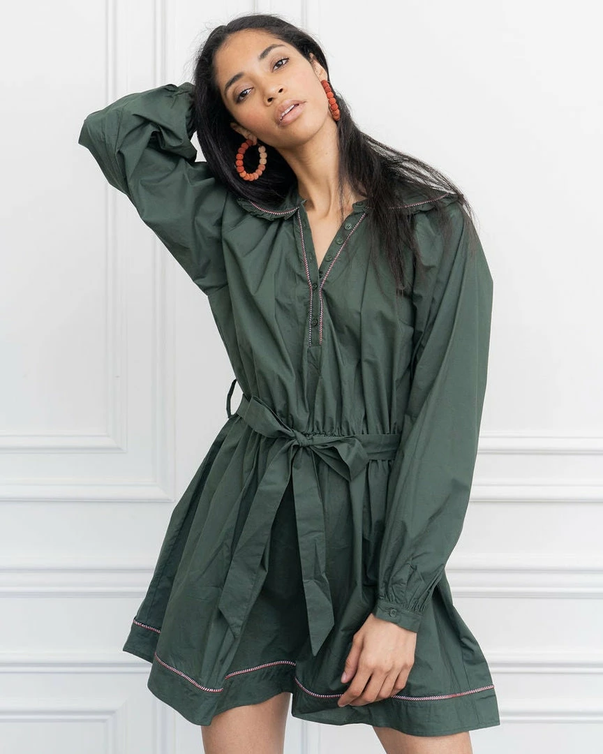 A dress for all seasons, not too short, an open neckline and a louche, relaxed fit.