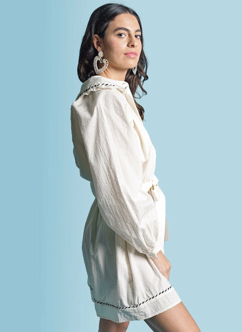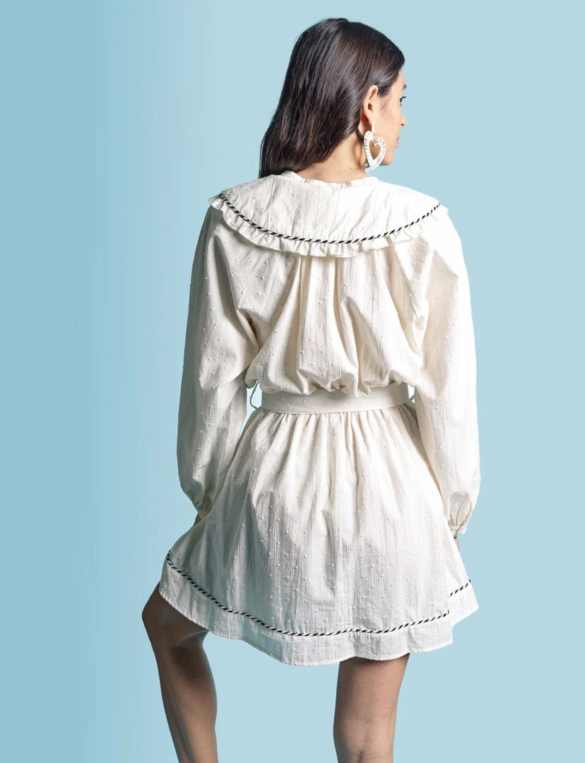 A dress for all seasons, not too short, an open neckline and a louche, relaxed fit. This one in our fresh cotton swissdot.