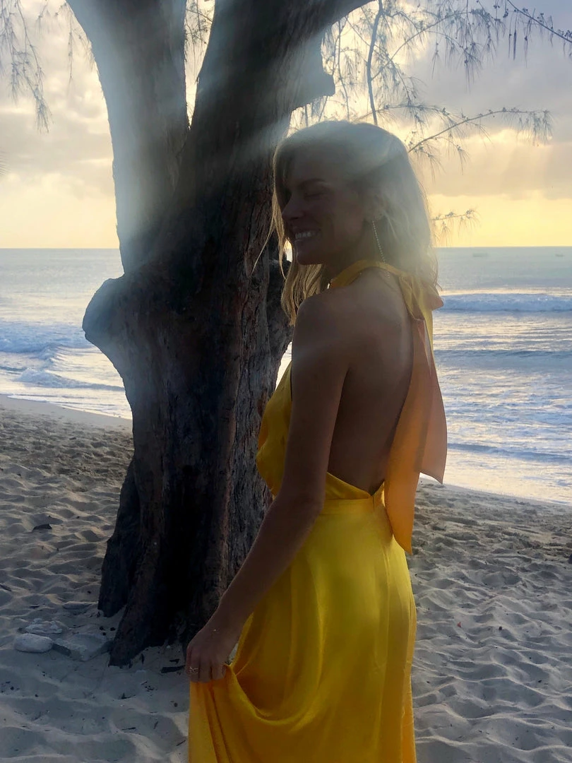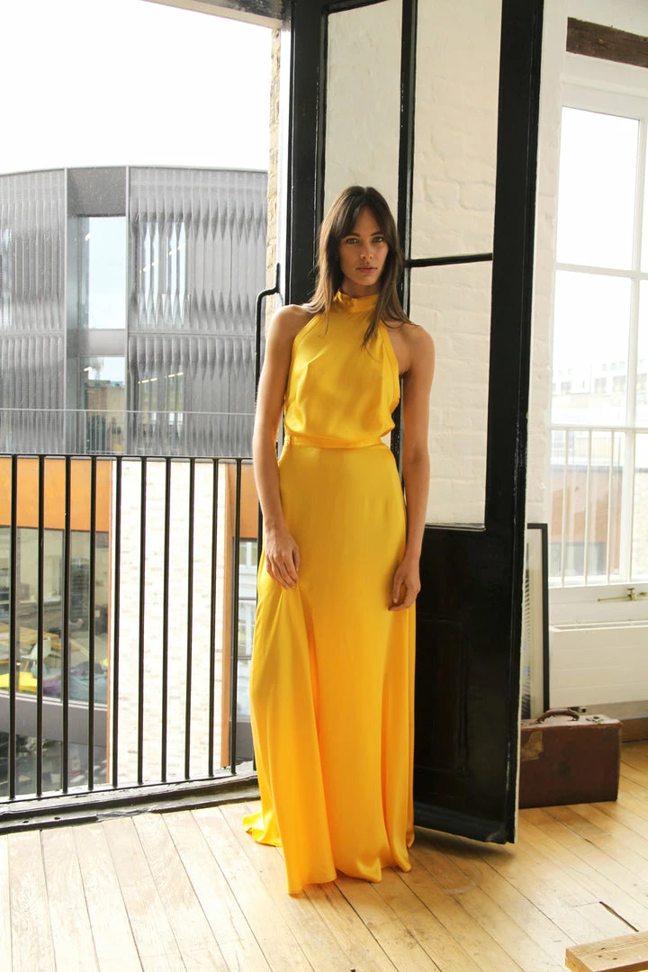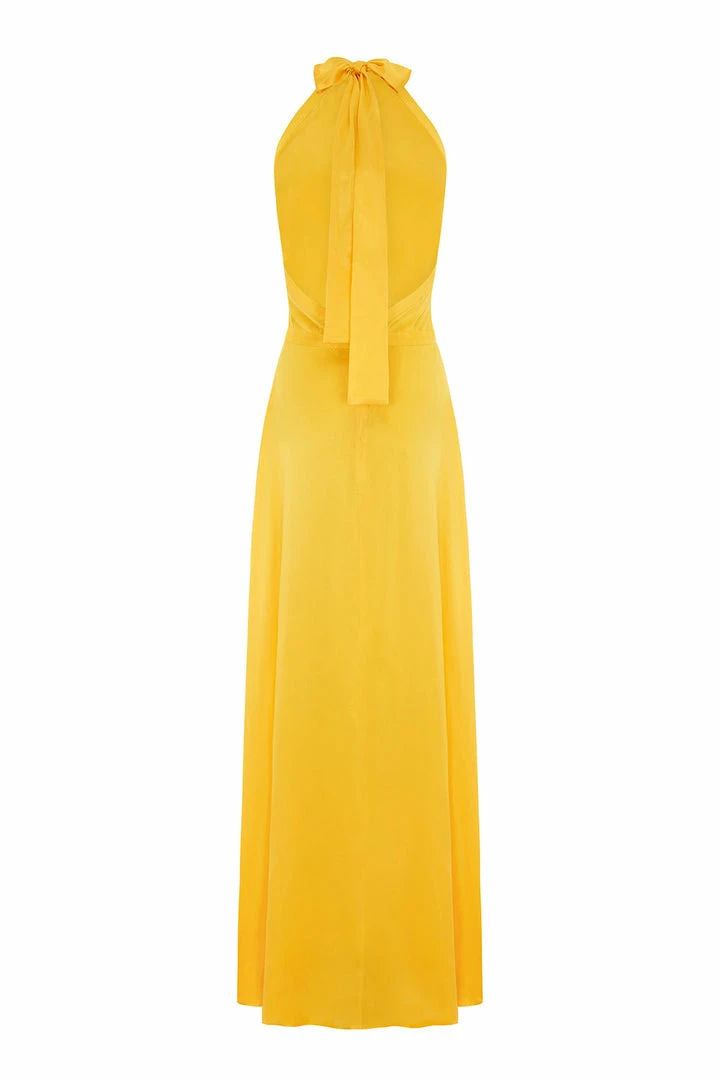 This floor-length wonder is the ultimate beauty and will make anyone feel like a true goddess, with its super flattering high waist skirt and the halter neck that fastened in the nape of the neck by long silk ties which fall down the length of the back.