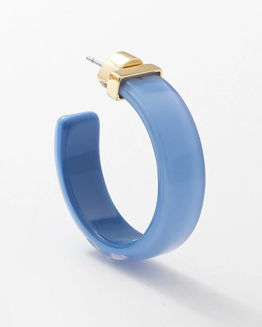 A day hoop that also loves a nightcap. This lightweight mid-size earring is crafted from three layers of glossy acetate (made from plant-based acetate) for fresh, contrasting color and finished with a heart-shaped postback for a little extra love.
