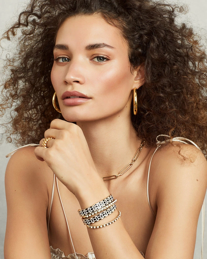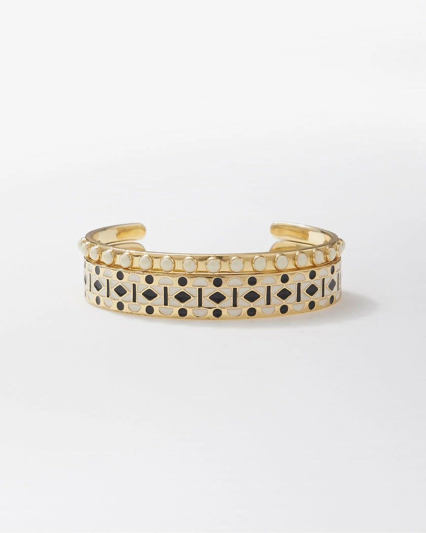 A sleek set of open bangle bracelets that easily adjust for a custom fit. Wear together or mix them in with your own collection, each one is finished with a luxuriously thick layer of ethically-sourced gold plating (we’re not shy) and a hand-enameled geometric design.