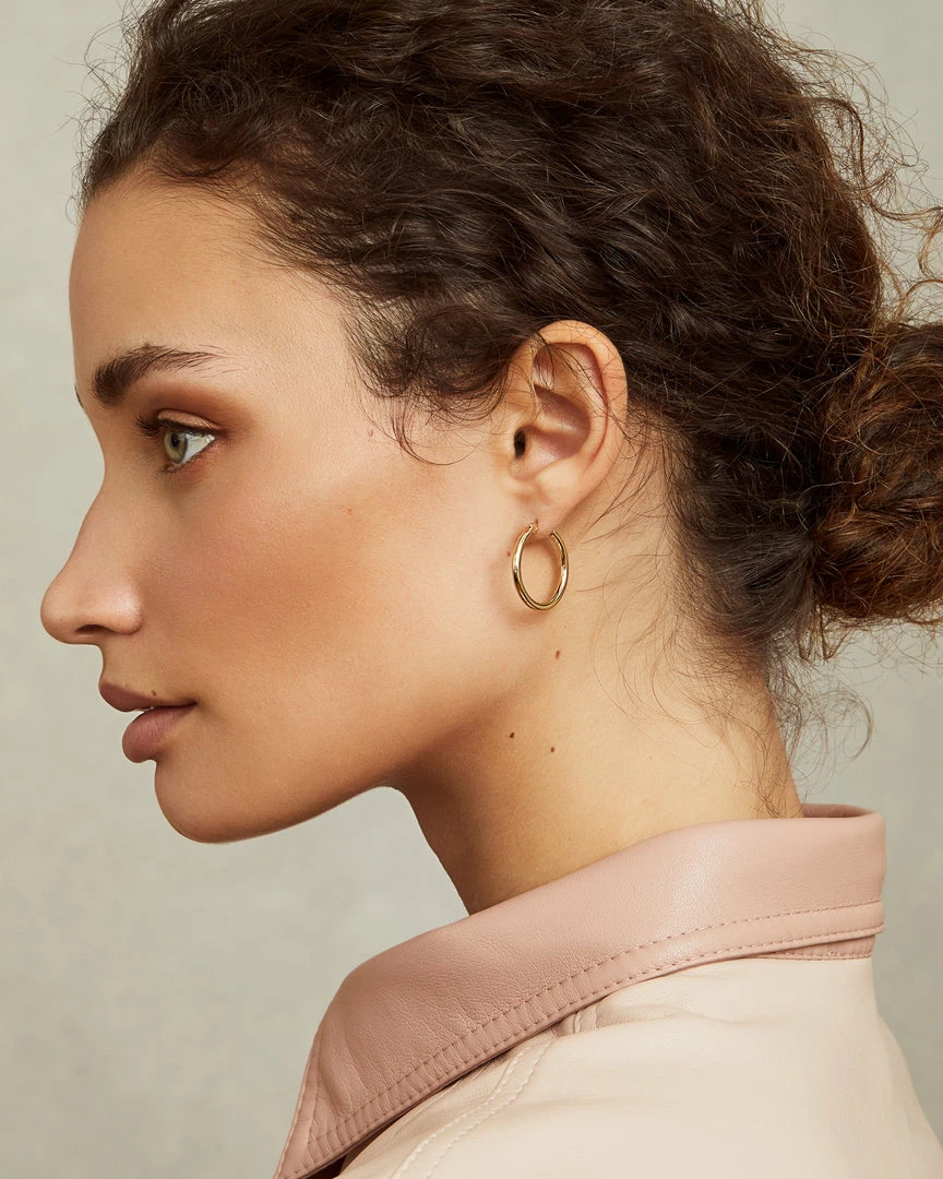 A forever-perfect minimalist hoop earring finished with a layer of ethically-sourced 14k gold plating. Wear solo or add one of our hookup charms (or pieces from your own collection) to switch up your look.Â