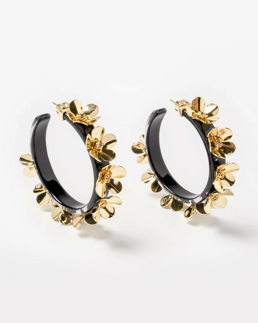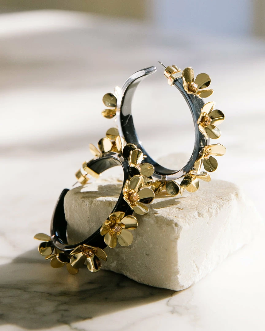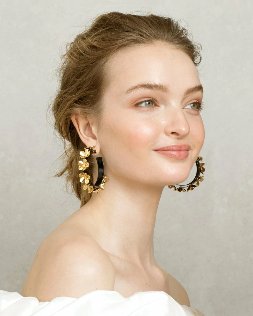 Our made-for-Holiday (and every other season) hoop earrings dotted with gold flowers and vintage rose crystals. Made from lightweight plant-based acetate and ethically-sourced gold. And—as if they weren’t cute enough—we finished each one with a heart-shaped postback.