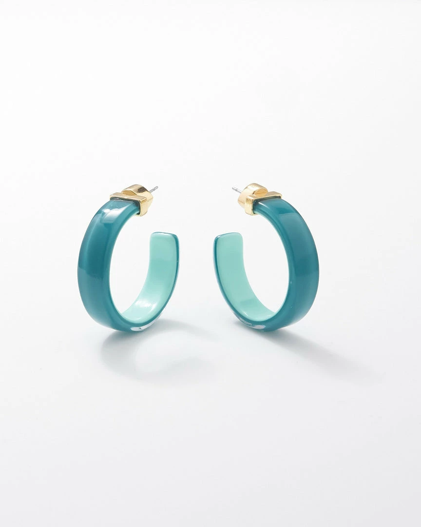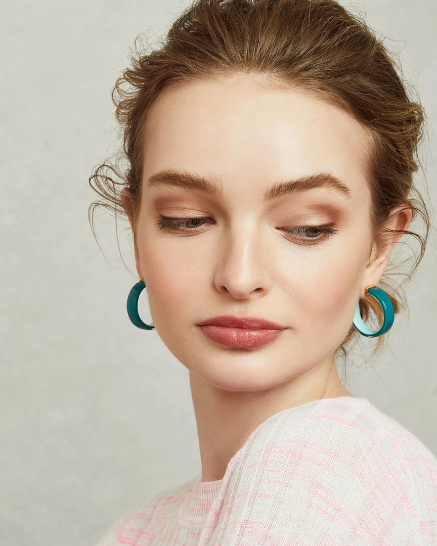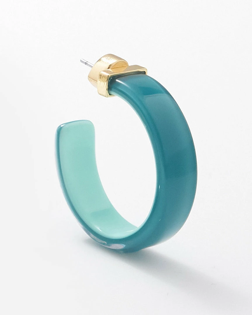 A day hoop that also loves a nightcap. This lightweight mid-size earring is crafted from three layers of glossy acetate (made from plant-based acetate) for bold, contrasting color and finished with a heart-shaped postback for a little extra love.